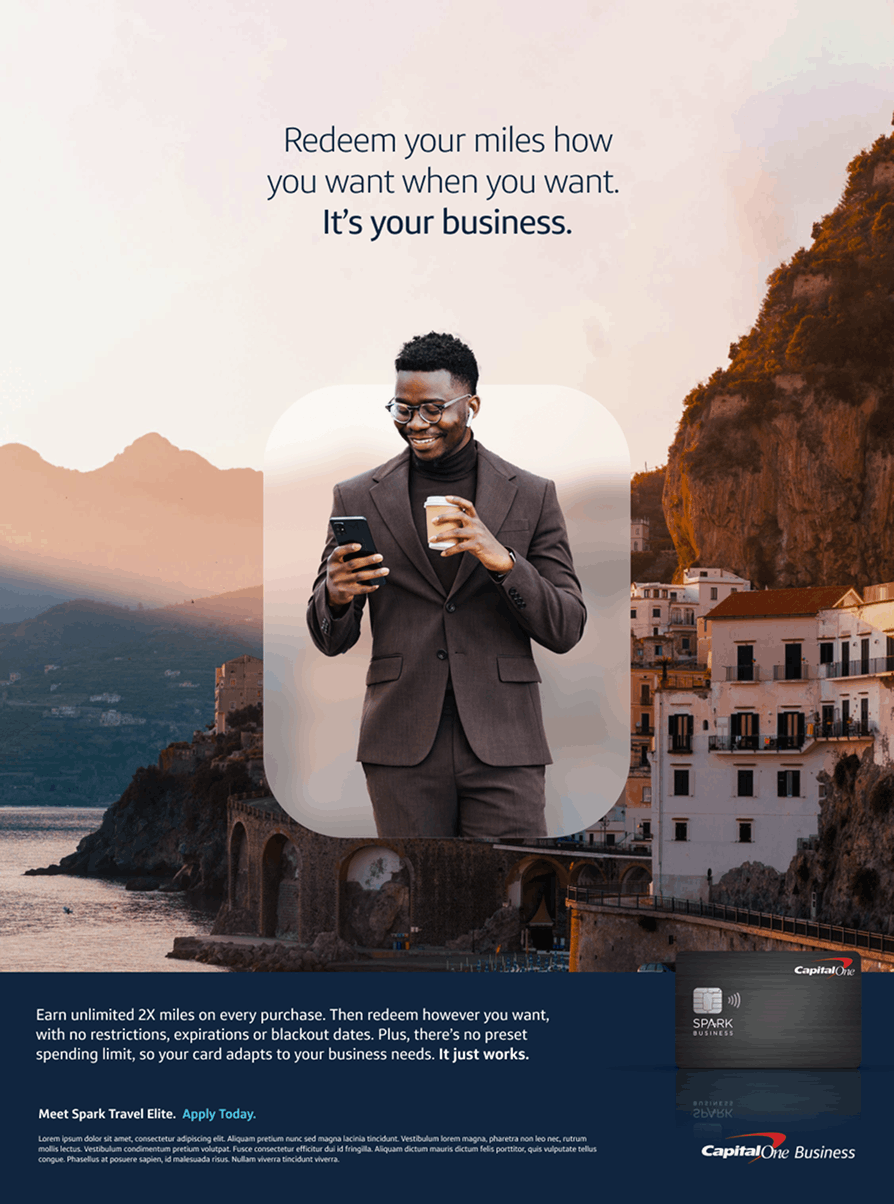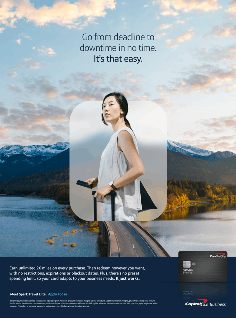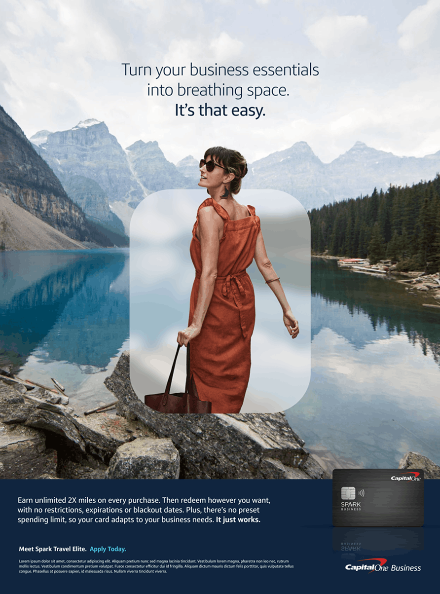During my time as a contractor with Capital One, I had the opportunity to lead creative development for the launch of their newest upmarket offering: Spark Travel Elite. The challenge was to capture the attention of hybrid business travelers with a campaign that felt premium, seamless, and distinct—while still living comfortably within the Capital One brand.